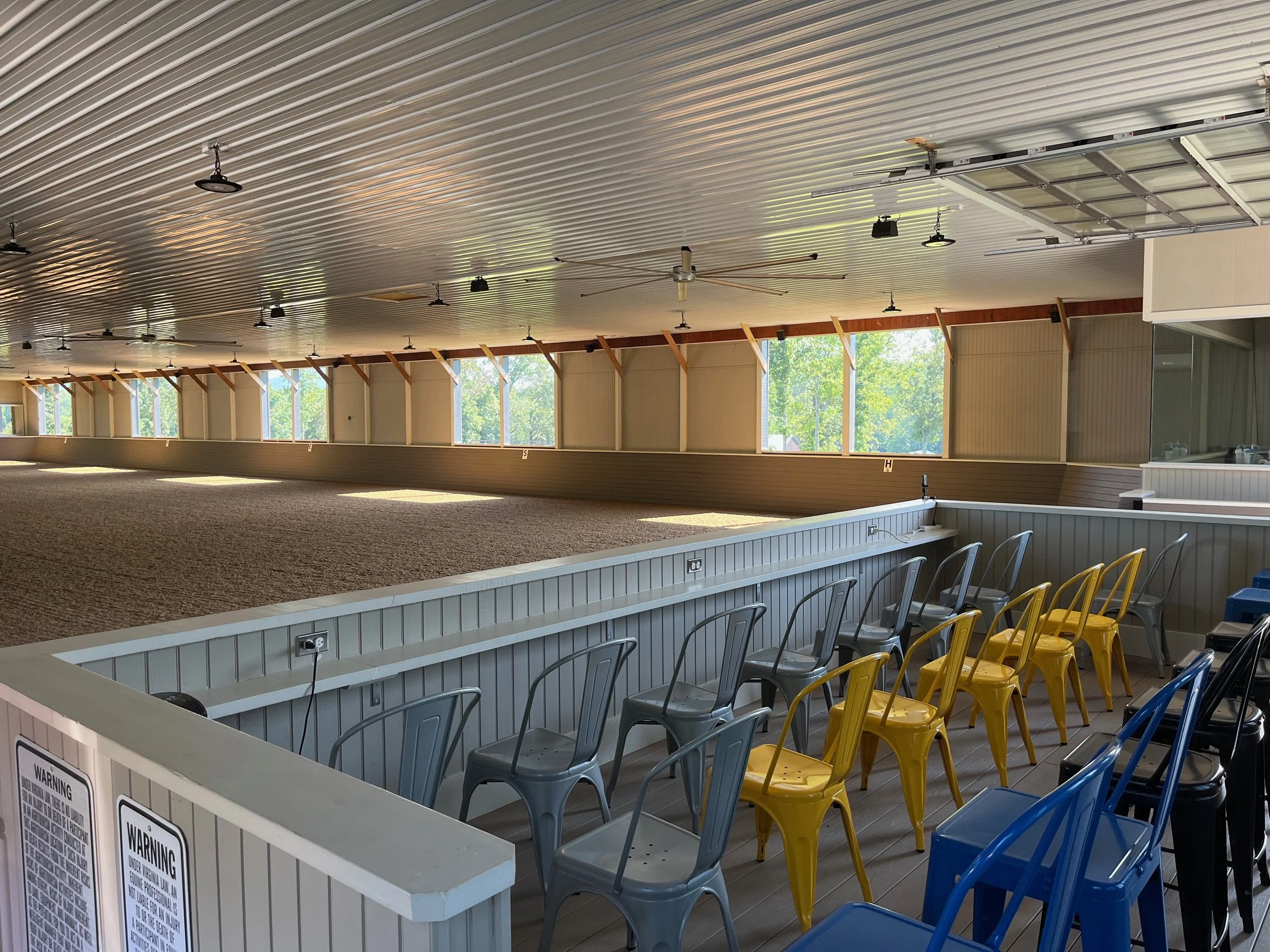 The insulated roof keeps the arena temperature moderate in all seasons and BigAss Fans keep the air moving in the heat of summer. Stereo surround sound speakers ensure all auditors hear what the clinician is saying. LED indoor arena lights provides proper light levels and balanced lighting.